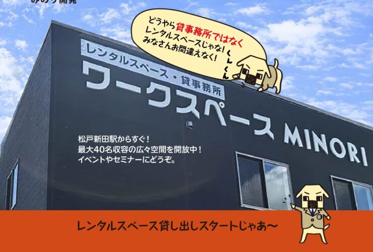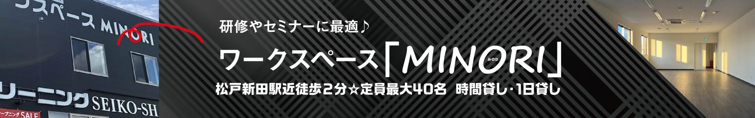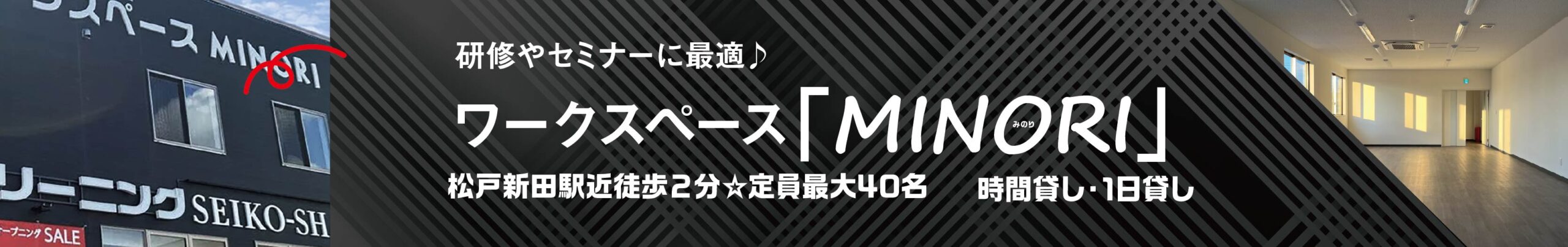 5月312026 ワークスペースminori ワークスペースMINORI。貸し出しをスタートしました。 レンタルスペース「ワークスペースMINORI」のご案内 ワークスペース「MINORI」松戸新田駅徒歩2分 |最大40名|セミナー講...
