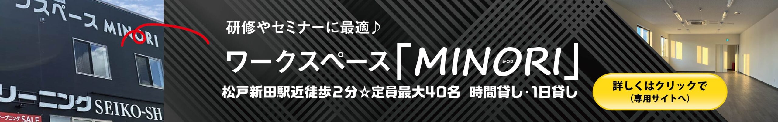 5月312026 ワークスペースminori 「ワークスペースMINORI」貸し出しスタート! レンタルスペース「ワークスペースMINORI」のご案内 ワークスペース「MINORI」松戸新田駅徒歩2分 |最大40名|セミナー講...