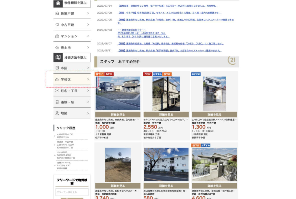 そこで便利だったのがTOP画面のサイドにある「学校区」で検索できるこの機能。